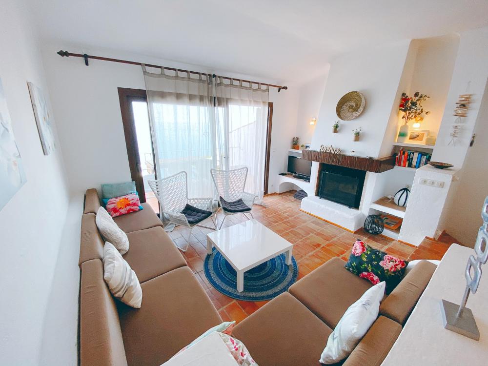 Mooi gelegen geschakelde woning voor 6 personen, met gebruik van het gemeenschappelijke zwembad. De woning heeft een fabelachtig mooi uitzicht op de Middellandse Zee en heeft airconditioning! Het huis heeft drie verdiepingen en beschikt over een woon-eetkamer, open keuken, drie 2-persoons slaapkamers, twee badkamers en twee terrassen.De woning is van alle moderne gemakken voorzien. De woon-eetkamer heeft een ruime eettafel en een gezellige zithoek. U heeft direct toegang tot het terras, vanwaar u weer geniet van het prachtige uitzicht. U beschikt in de woonkamer o.a. over een openhaard, Wifi, Nederlandse satelliet TV. Bij beide terrassen zijn schuifpuien geplaatst, waardoor u nog meer kunt genieten van het uitzicht.Ook de keuken is zeer volledig. Zo beschikt u over een vaatwasser, een koel-vrieskast, inductie kookplaat, hete luchtoven, aparte magnetron, staafmixer, koffiezetapparaat en een magnetron-sterilisator voor babyflesjes.Verdeeld over de boven- en benedenverdieping heeft u drie 2-persoons slaapkamers. Beneden heeft u één slaapkamer met een 2-persoonsbed en een eigen badkamer. Deze slaapkamer beschikt ook over een groot terras met zeezicht. Hier staan ook drie ligbedden om te genieten van de zon. Op de bovenverdieping zijn de twee andere 2-persoons slaapkamers. De trappen zijn voorzien van zgn. Kinderhekjes. Alle slaapkamers zijn voorzien van airconditioning.Ook de twee badkamers zijn gemoderniseerd. De bovenbadkamer is voorzien van prachtige authentieke tegels, gecombineerd met een moderne wastafel, meubelen en douchescherm. De badkamer op de benedenverdieping is voorzien van een mooie ruime douche, wastafel en toilet. Er is tevens een babyhouder/zitje voor in bad.Op 1 minuut lopen van het huis kunt u gebruik maken van een groot zwembad met grasveld, dat u deelt met de omliggende huisjes en appartementen. Op uw eigen terrassen heeft u uw privacy en het mooie ruime uitzicht.