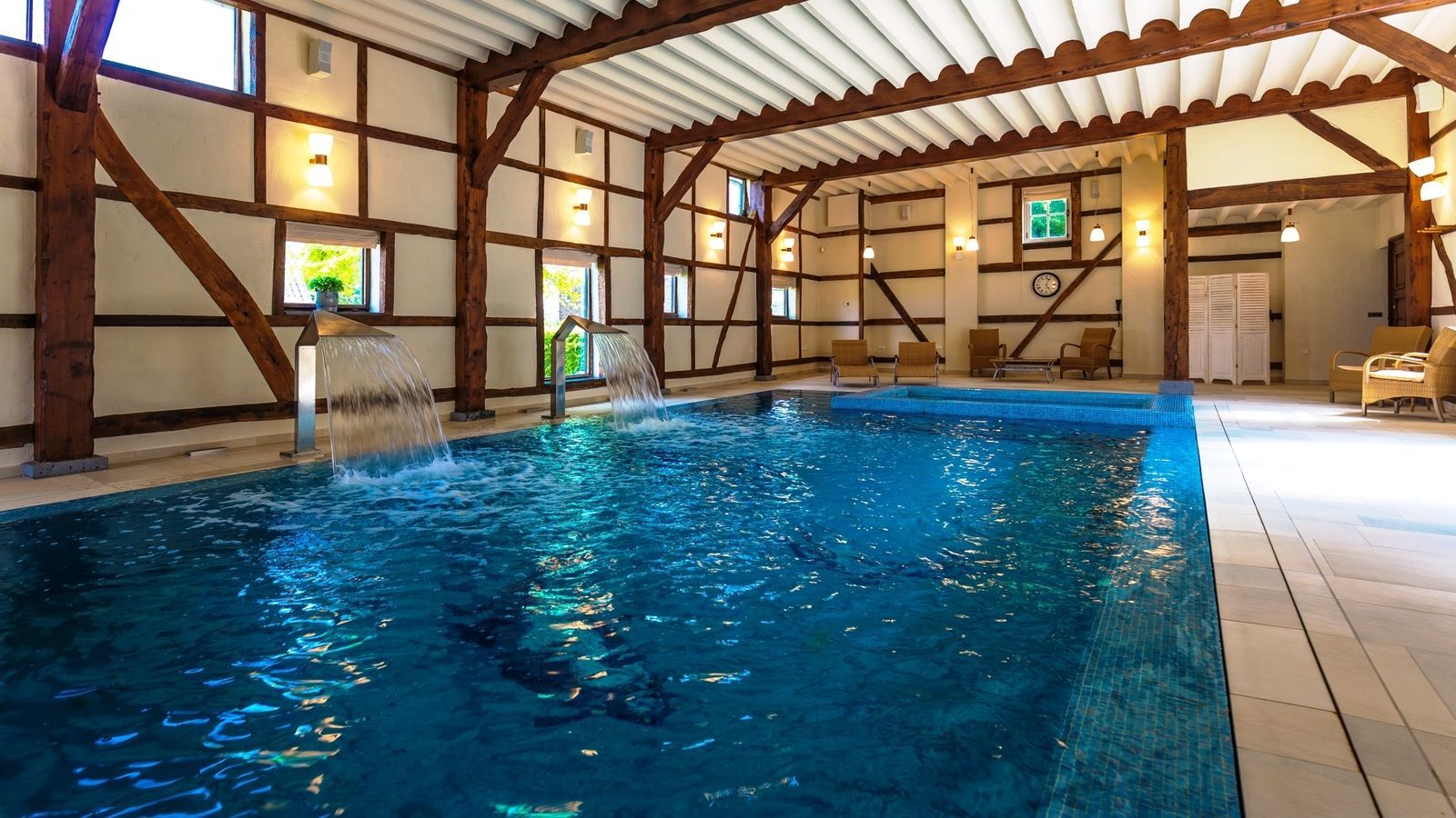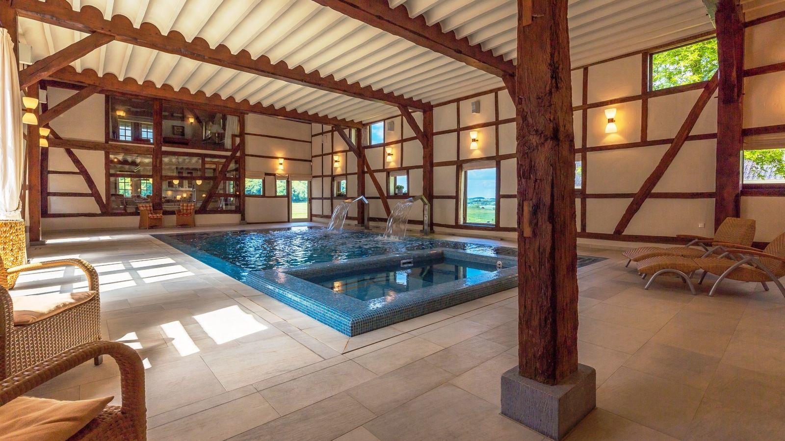 In de rechtervleugel bevindt zich de wellnessruimte met binnenzwembad (60m² met rolluik) met 2 watervaljets en bubbelbad. Er is een douche en apart toilet.