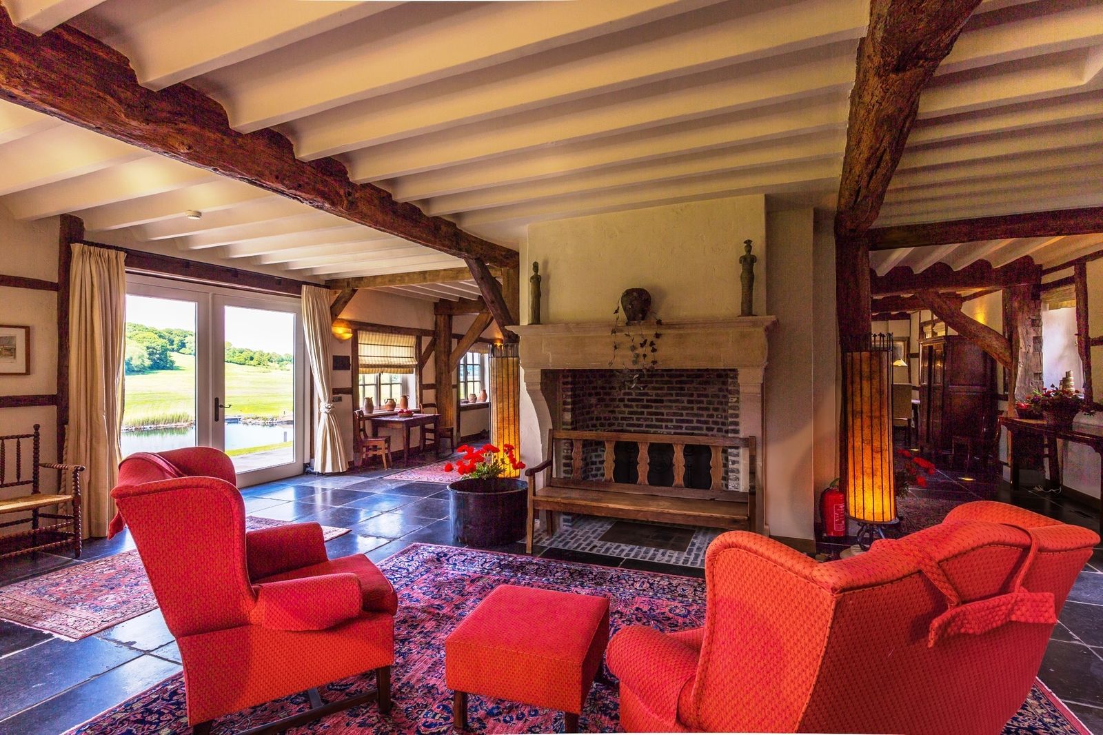 Ruime woonkamer met in het midden aan beide zijden een grote schouw met open haard waaromheen comfortabele banken en fauteuils staan. In een gedeelte staat een TV , DVD en stereo-installatie.