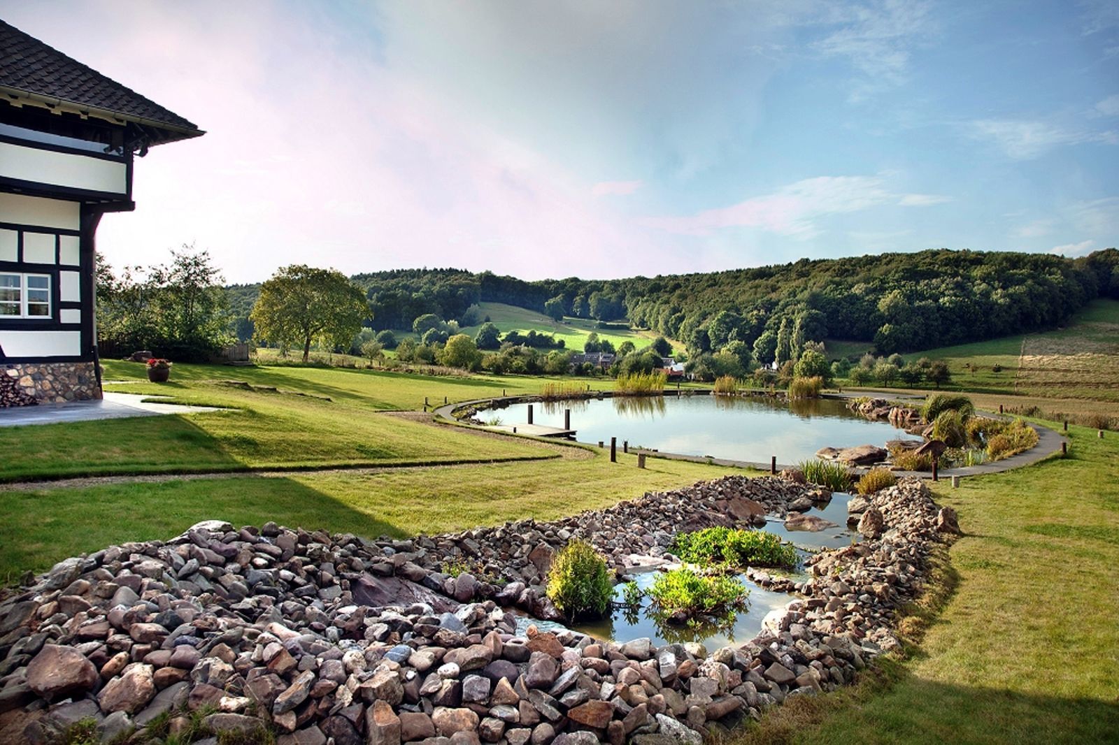 Enorme tuin met gazon en vijver (géén zwemvijver) en uitzicht op de Limburgse heuvels.