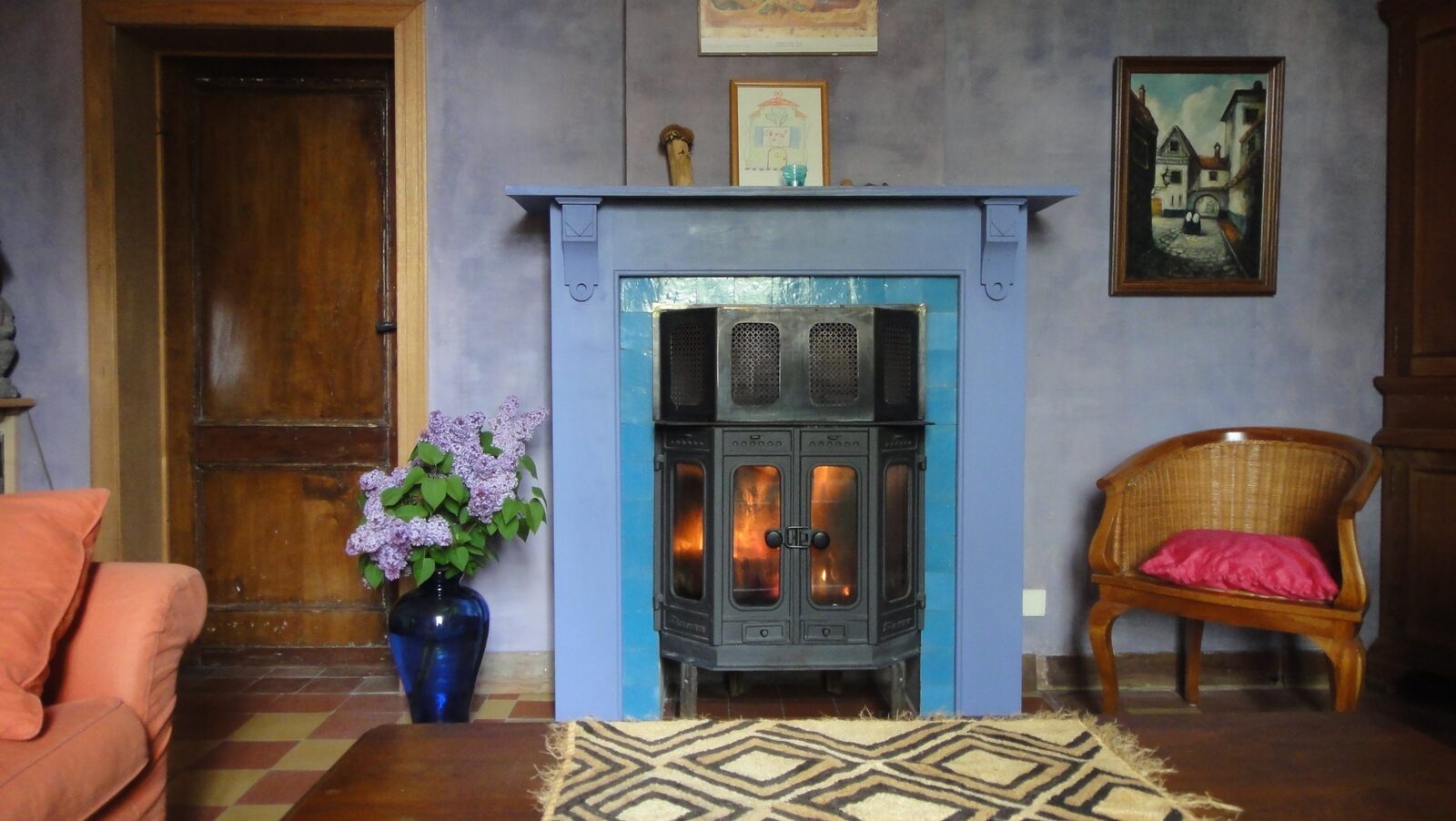 Links van de gang is de woonkamer met zitgedeelte en houtkachel.