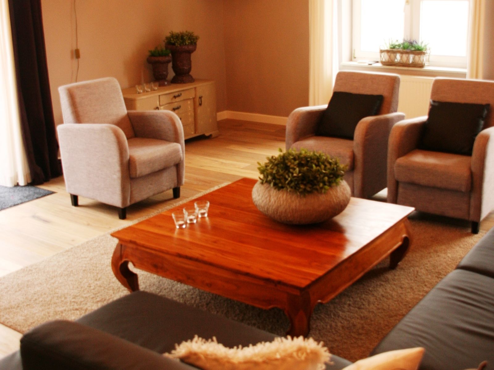 Ruime woonkamer met diverse comfortabele zithoeken, stereo-set met cd-speler en TV (NL-zenders). Er zijn gezelschapsspellen en een kast met boeken en tijdschriften. Vanuit de woonkamer kijkt u uit over het terras en de tuin.
