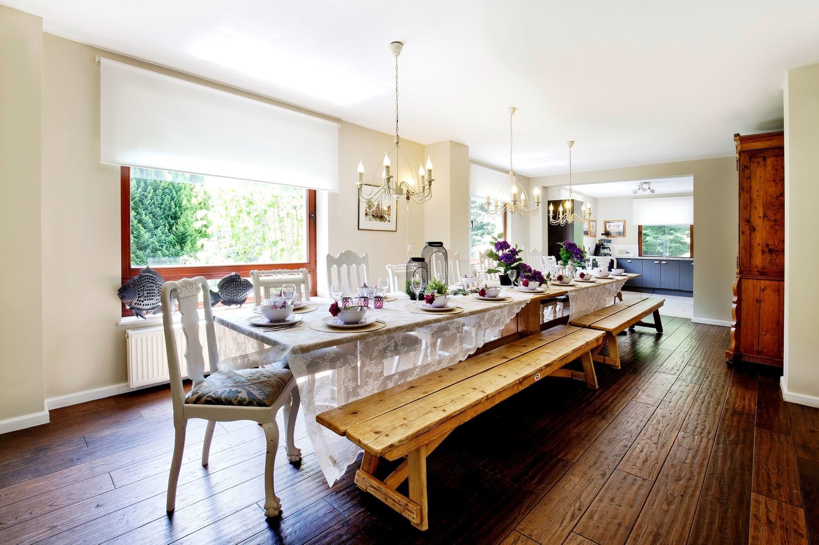 Aparte eetkamer met lange eettafel (5,50m lang) met stoelen en banken.