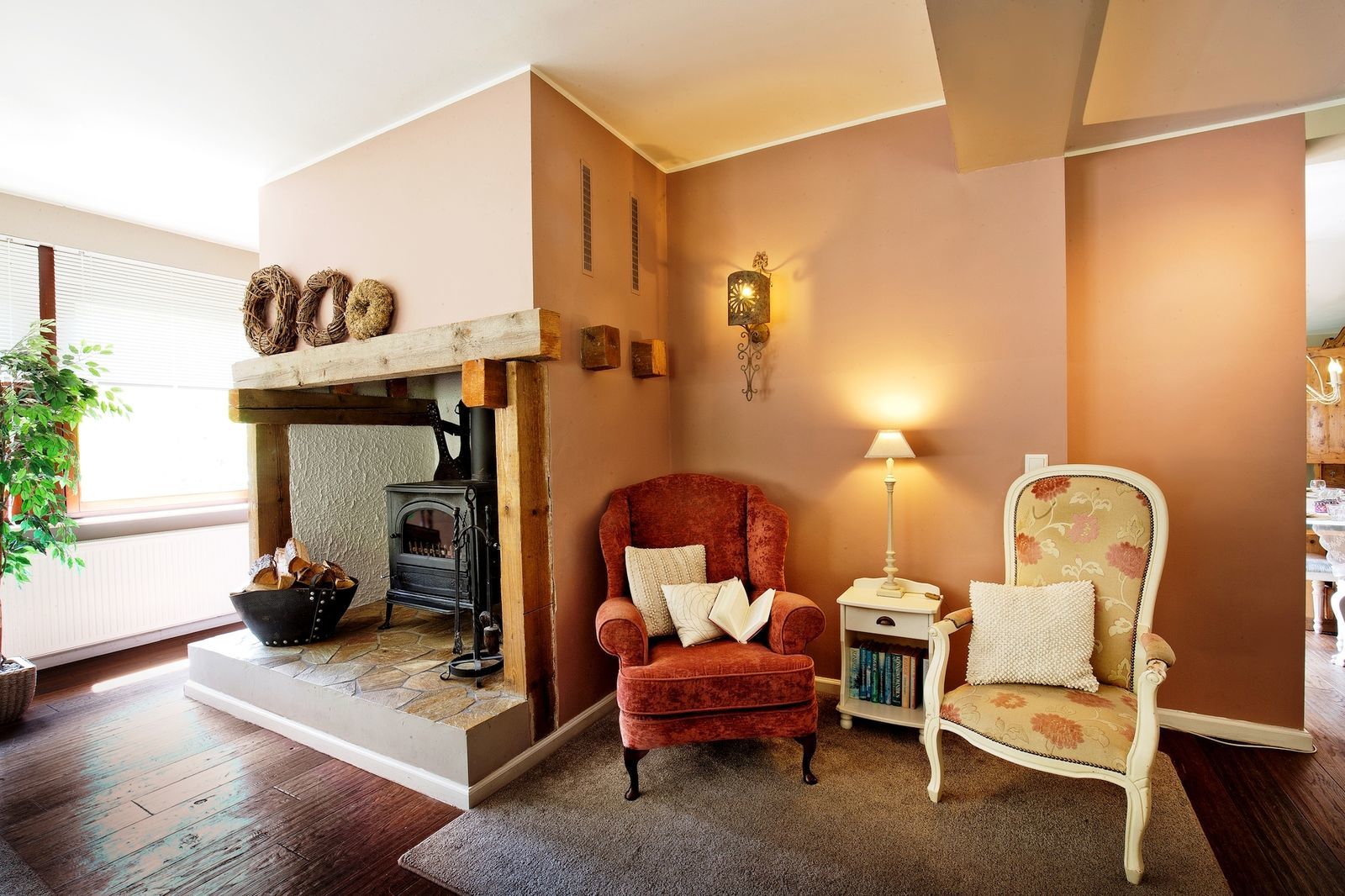 Ruime woonkamer met diverse comfortabele zithoeken, stereo-set met cd-speler en TV (NL-zenders) en houtkachel.