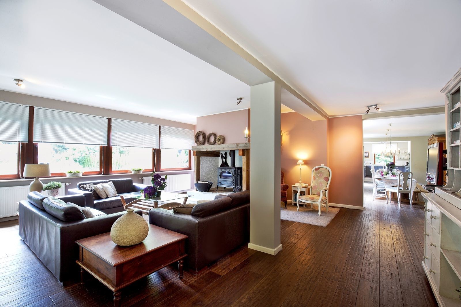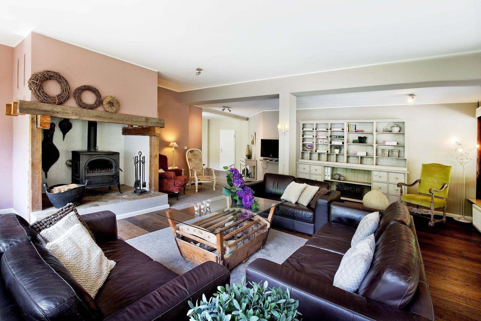 Ruime woonkamer met diverse comfortabele zithoeken, stereo-set met cd-speler en TV (NL-zenders) en houtkachel.