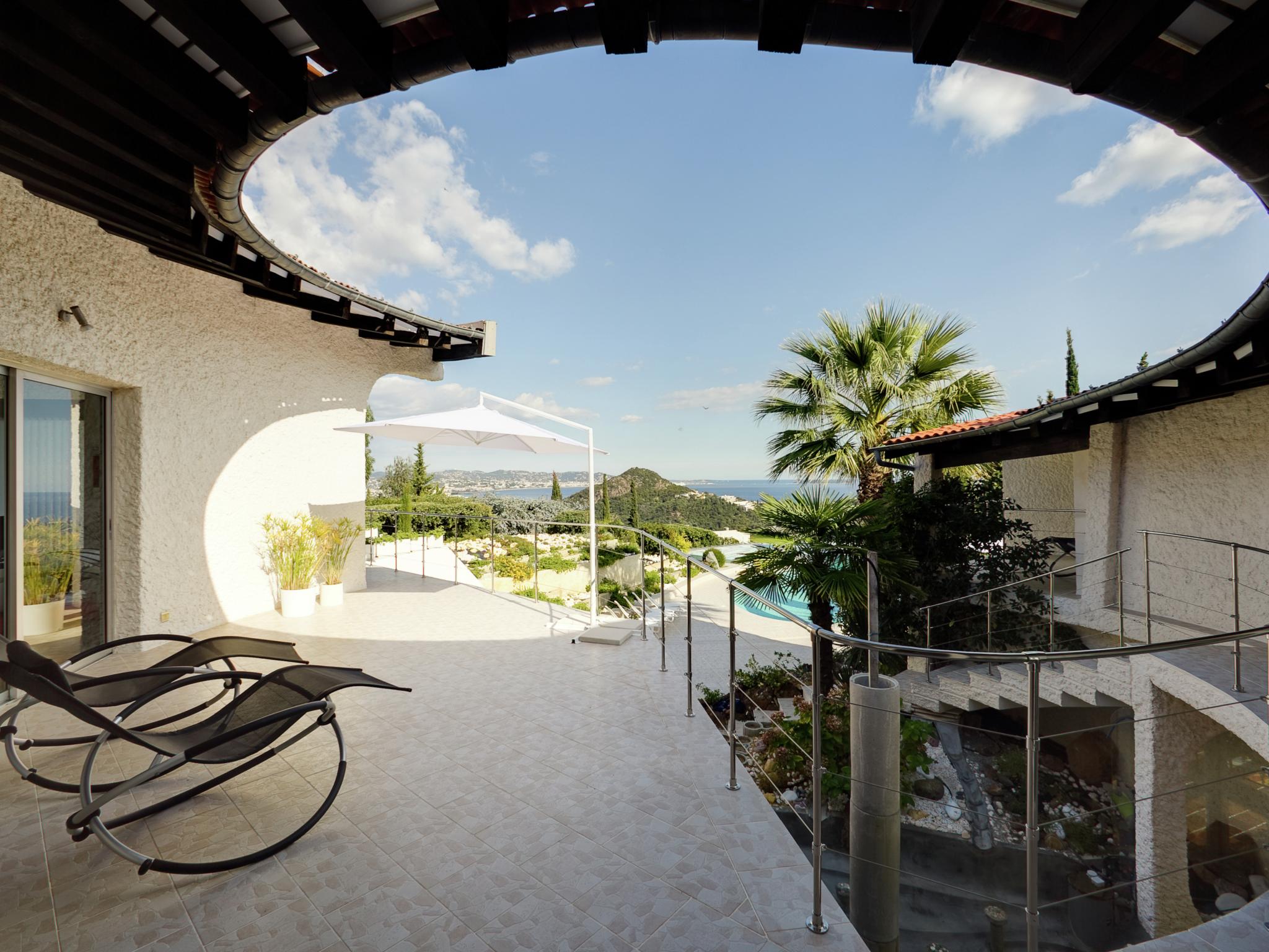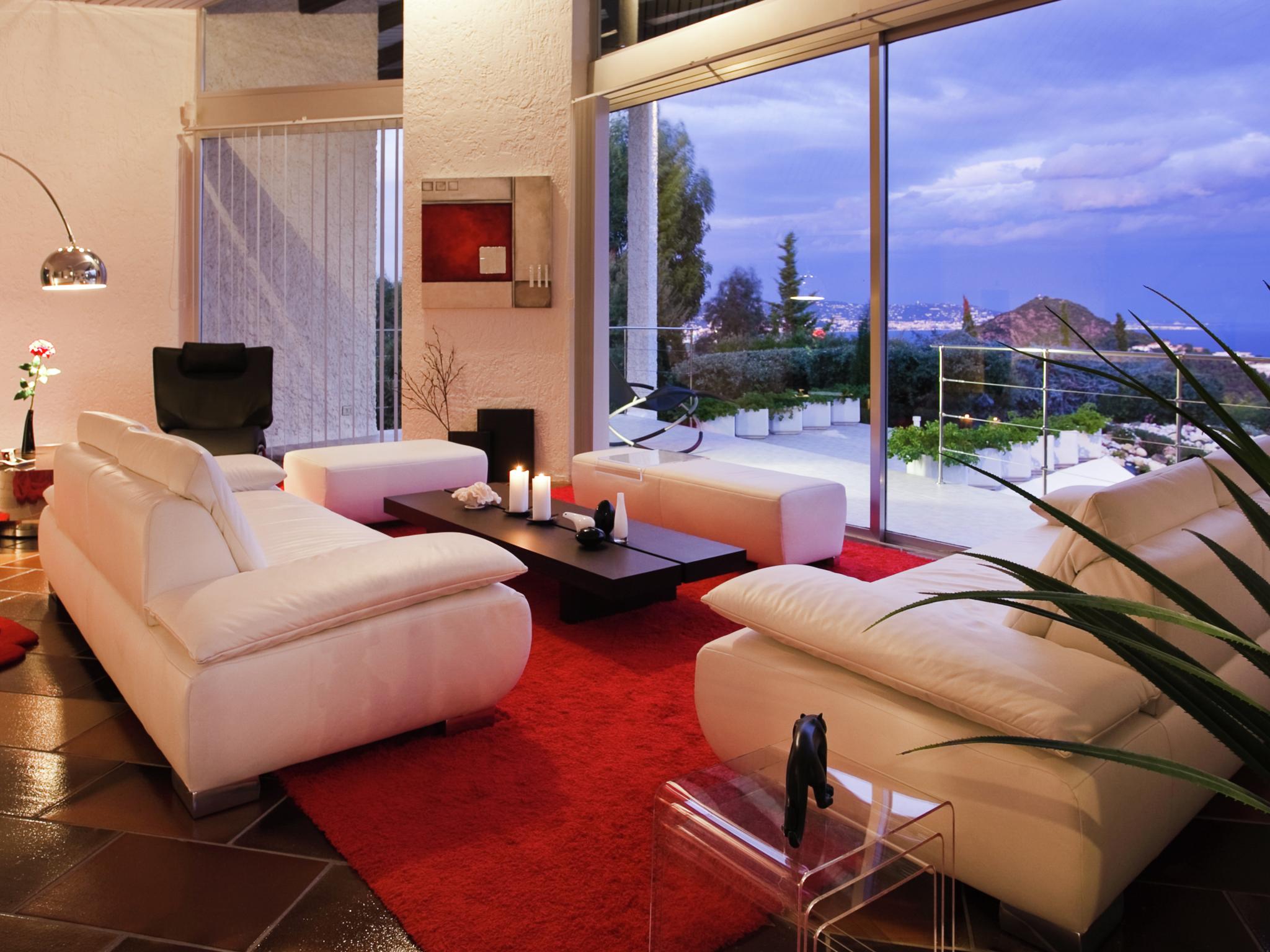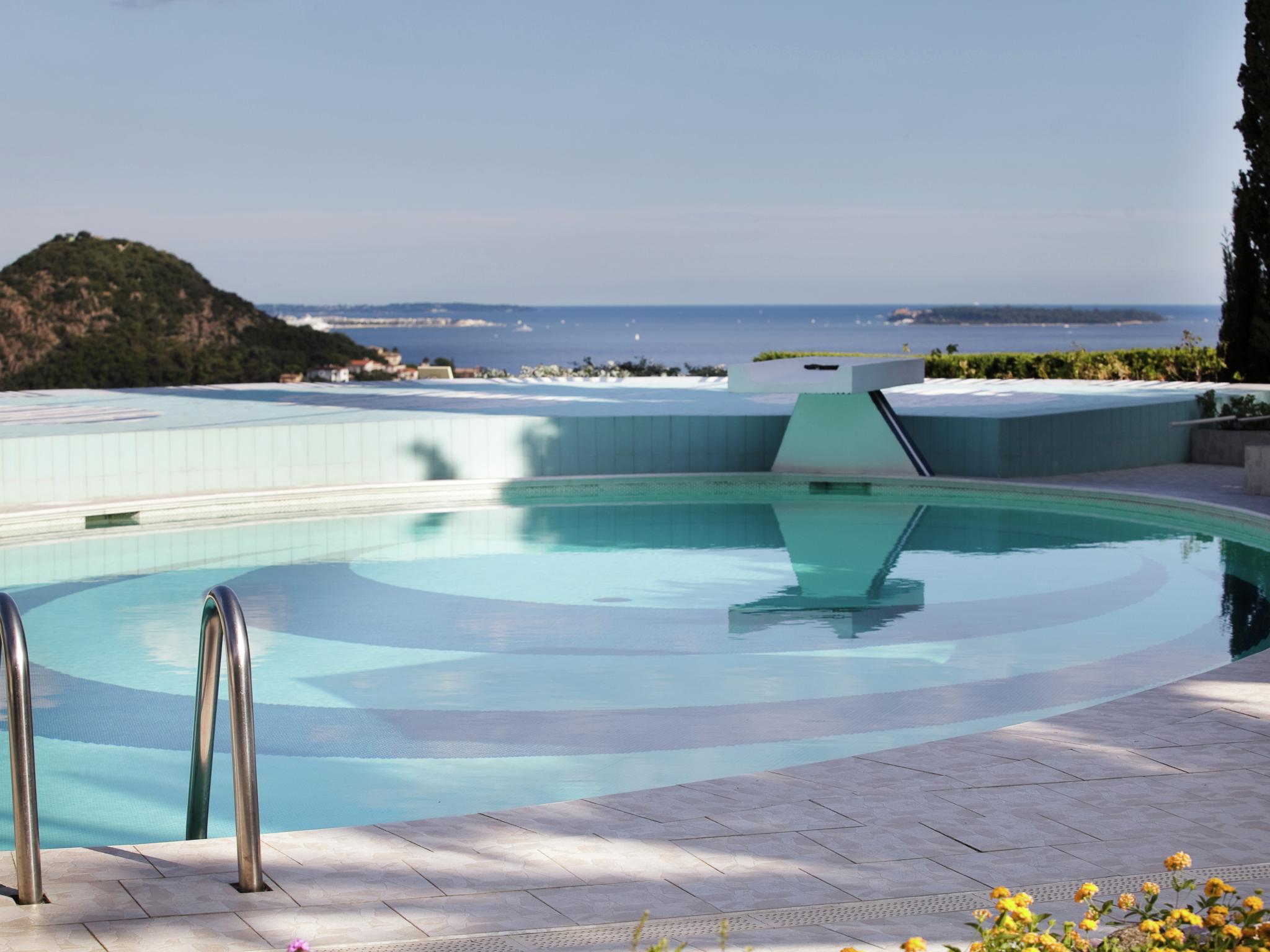Een architectonisch hoogstandje! Prachtige villa in retrolook met schitterend privé- zwembad, fraai aangelegde tuin en op een afgesloten domein van 300 hectare met 4 tennisbanen en een olympisch groot zwembad. De villa ligt hoog op een heuvel met schitterend uitzicht over de baai van Cannes. Je zit hier heerlijk rustig met veel privacy. In de zeer ruime villa zijn 4 luxe slaapkamers met eigen badkamer, er is een wellnessruimte, een prachtige bar en fraaie terrassen met mooie kunstwerken