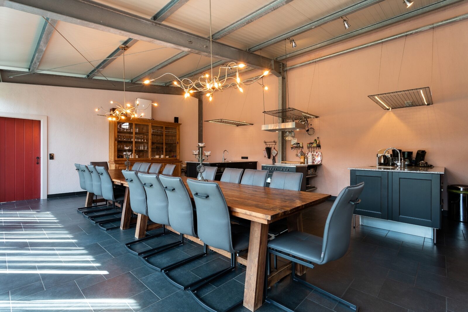 Lange eettafel met stoelen.