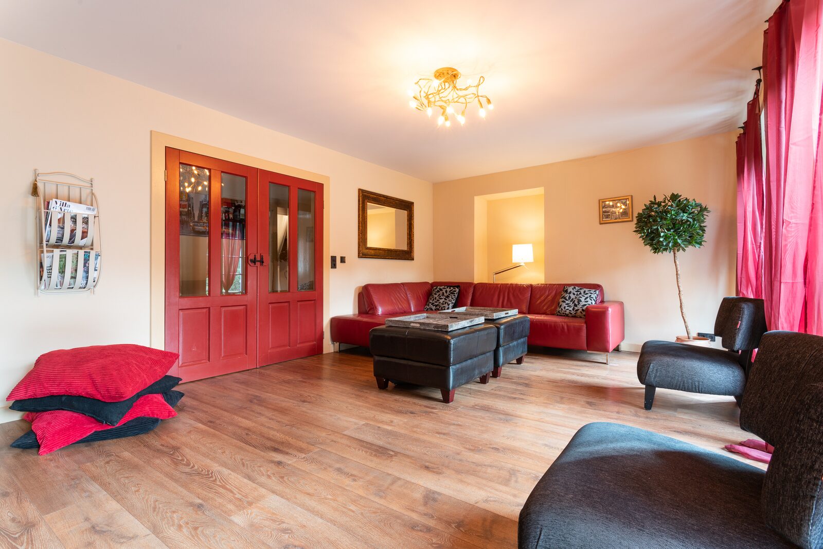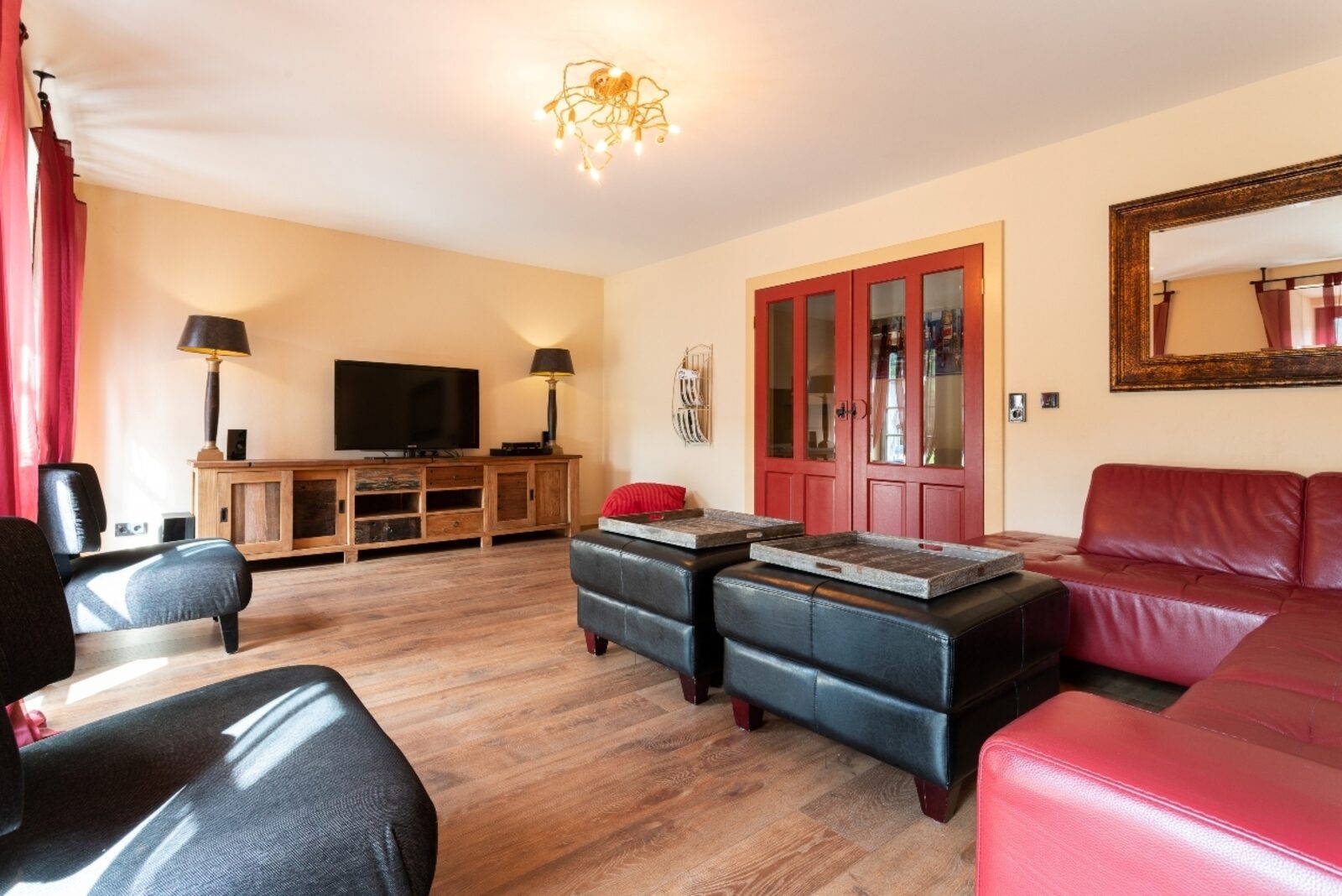 Woonkamer met comfortabel zitgedeelte met banken, lage zitstoelen en zitkussens, tv met dvd-speler. Uitzicht op het terras en de tuin.