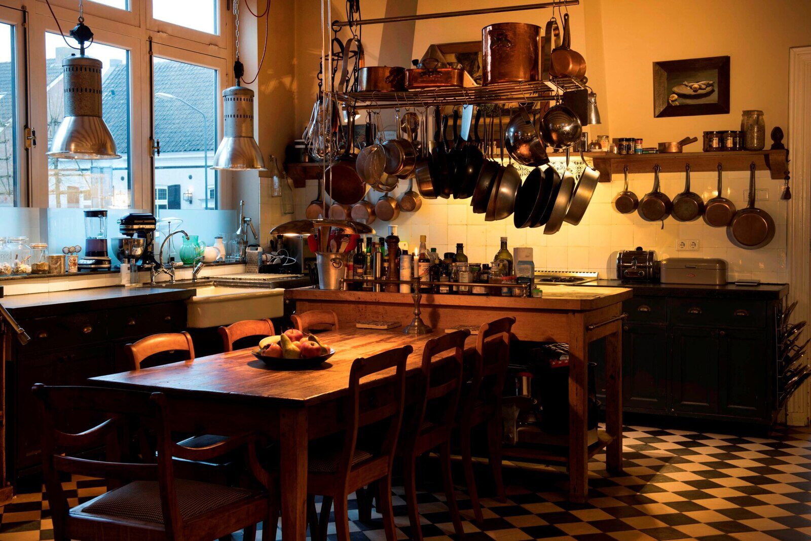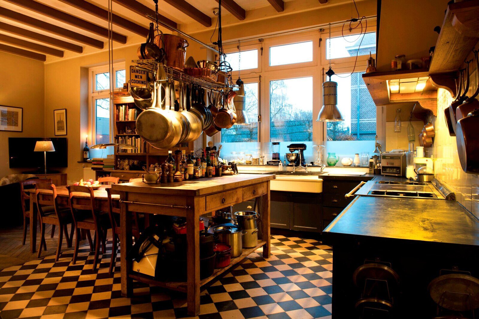 Leefkeuken met zithoek en tv bij de open haard en (kleine) eettafel. De keuken is meer dan compleet met o.a. grote koel/vriescombinatie, gasfornuis (5-pits met warmtezone, professionele capaciteit 5,2kW), grote (gas)oven met warmhoudkast, magnetron, Quooker, dubbele wasbak, vaatwasser, koffiezetapparaat en Nespressomachine (zelf cups meenemen).