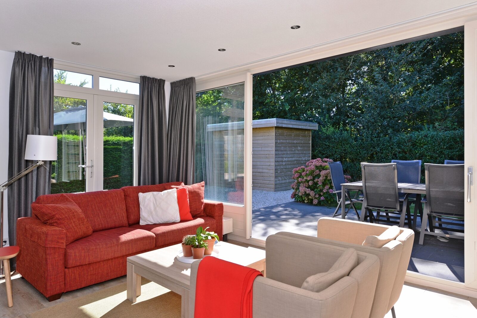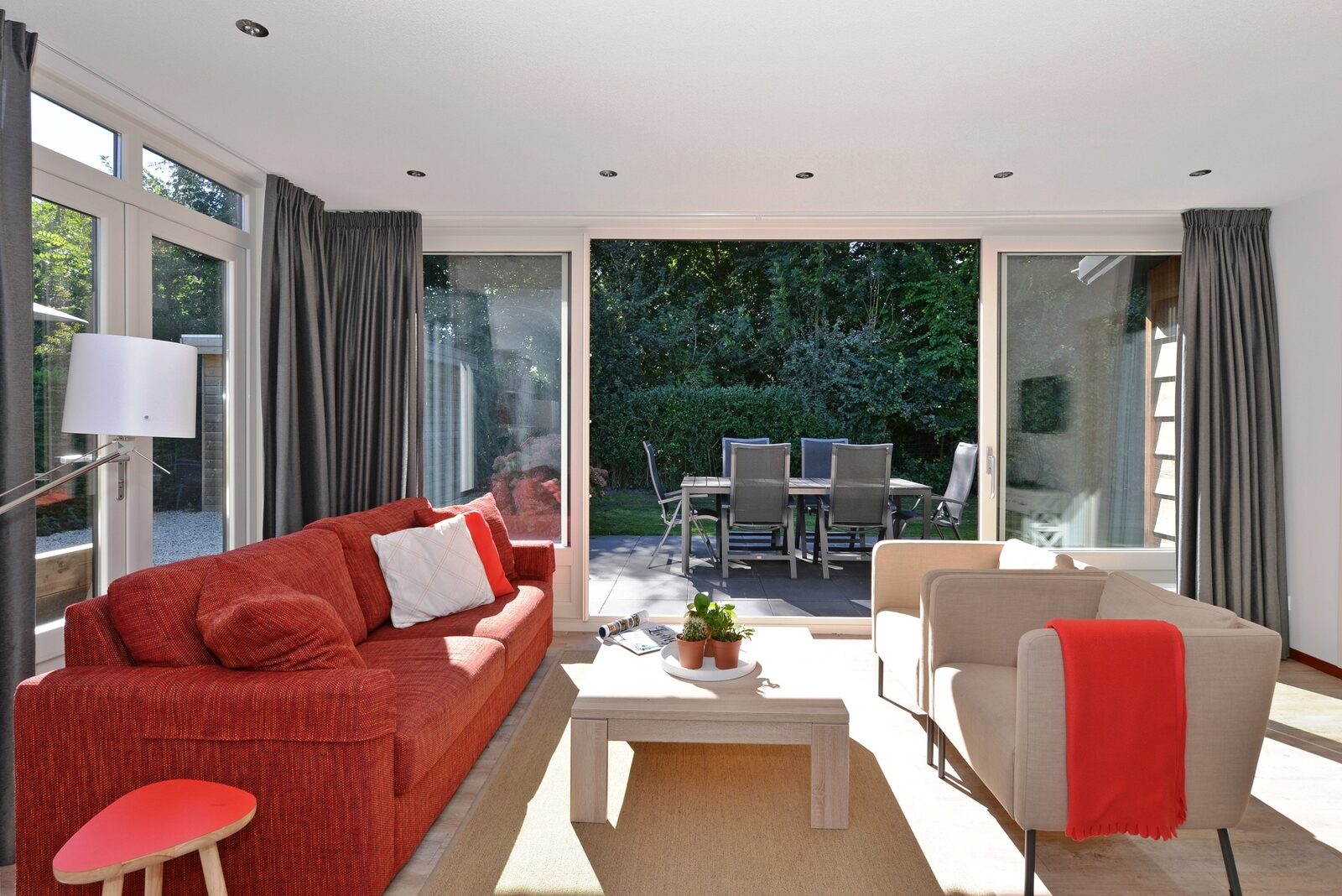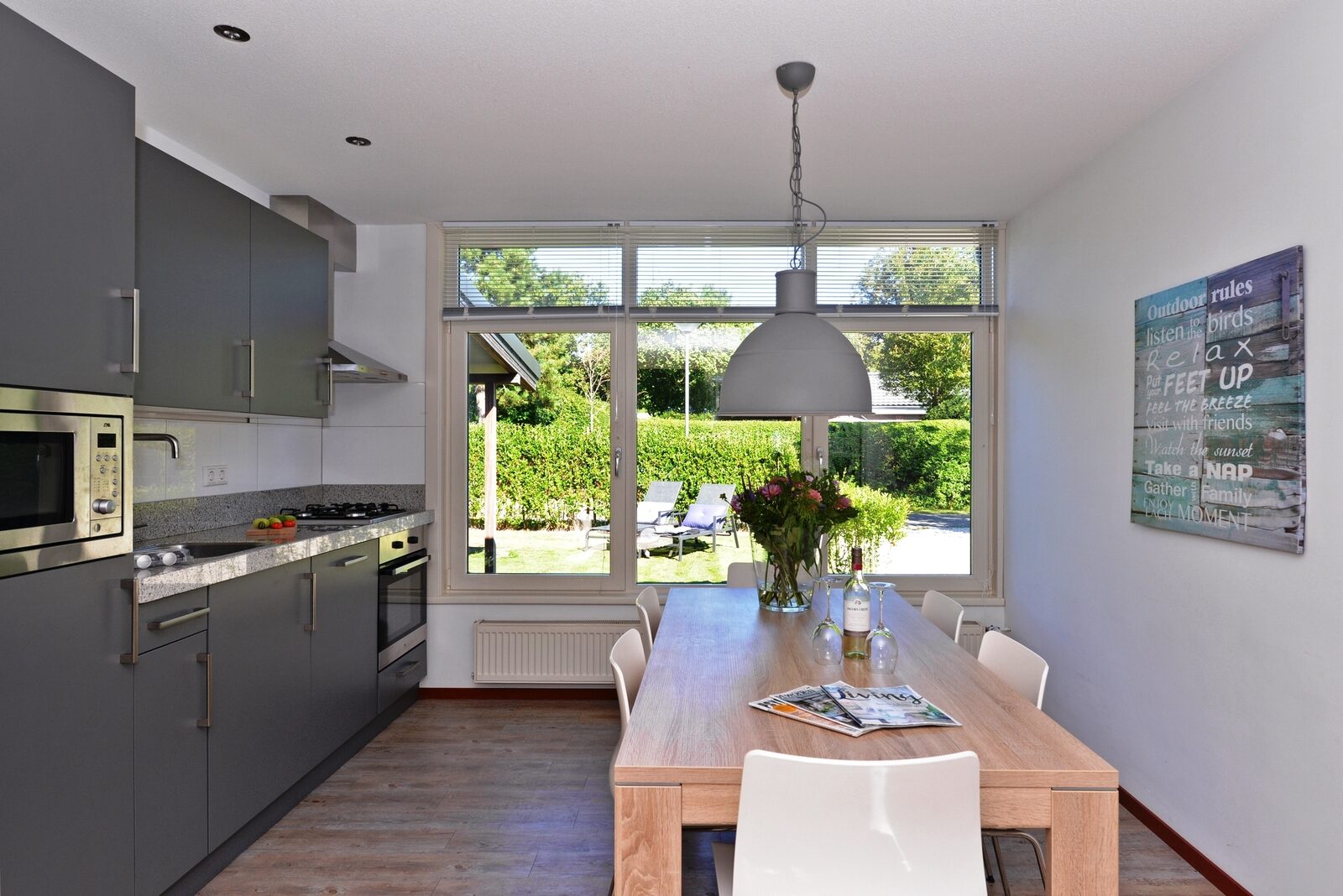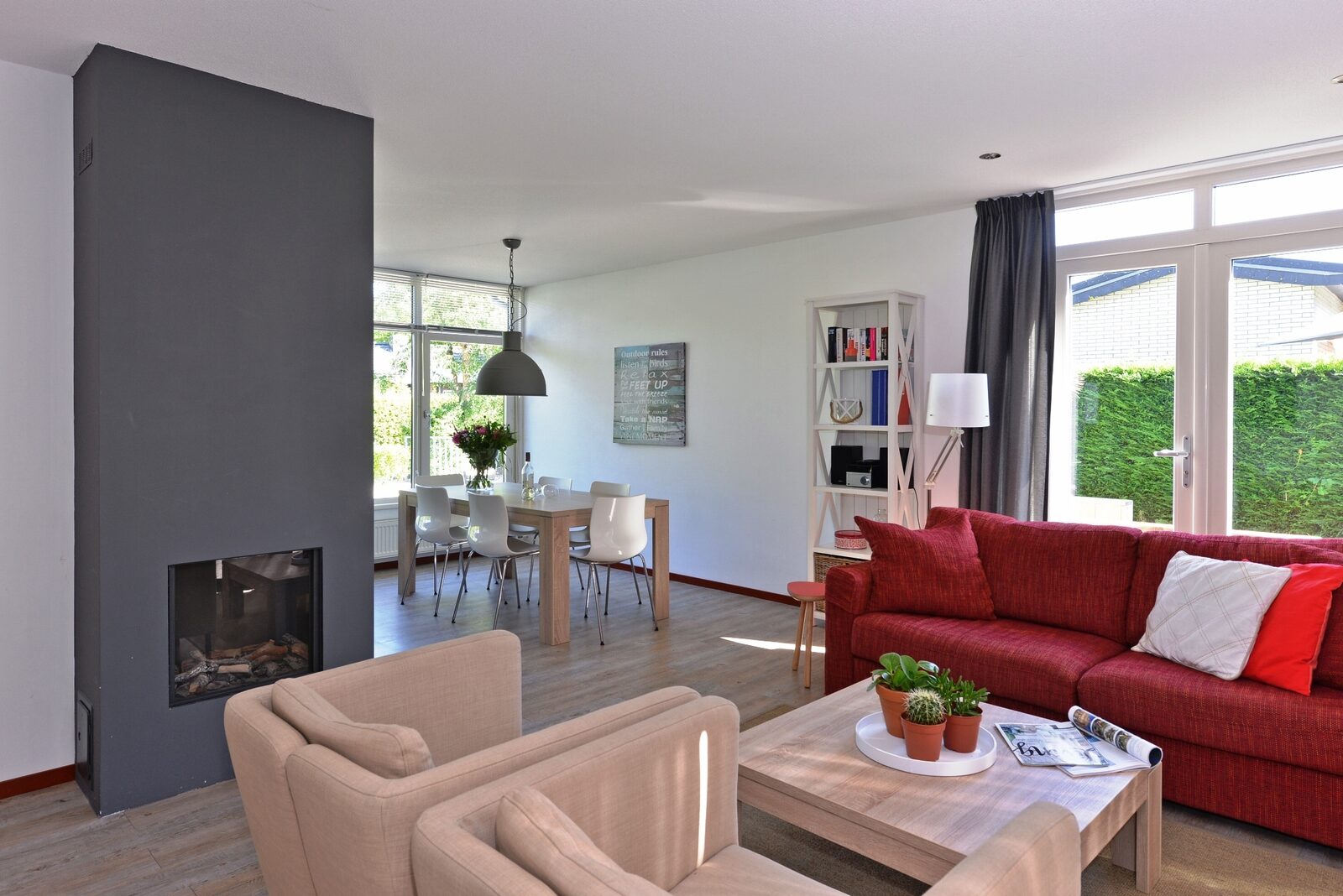 Het vakantiehuis is rustig gelegen en heeft een ruime en afgesloten tuin. Door de vele ramen is dit vakantiehuis in Nederland heerlijk licht. Het huis is gelijkvloers.