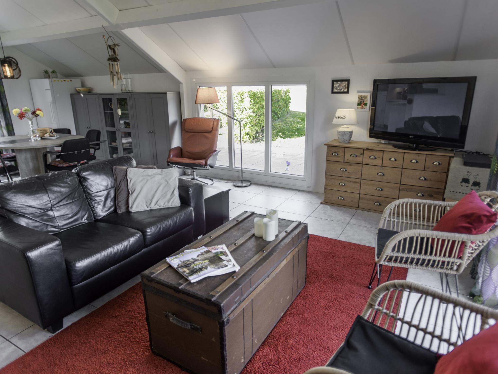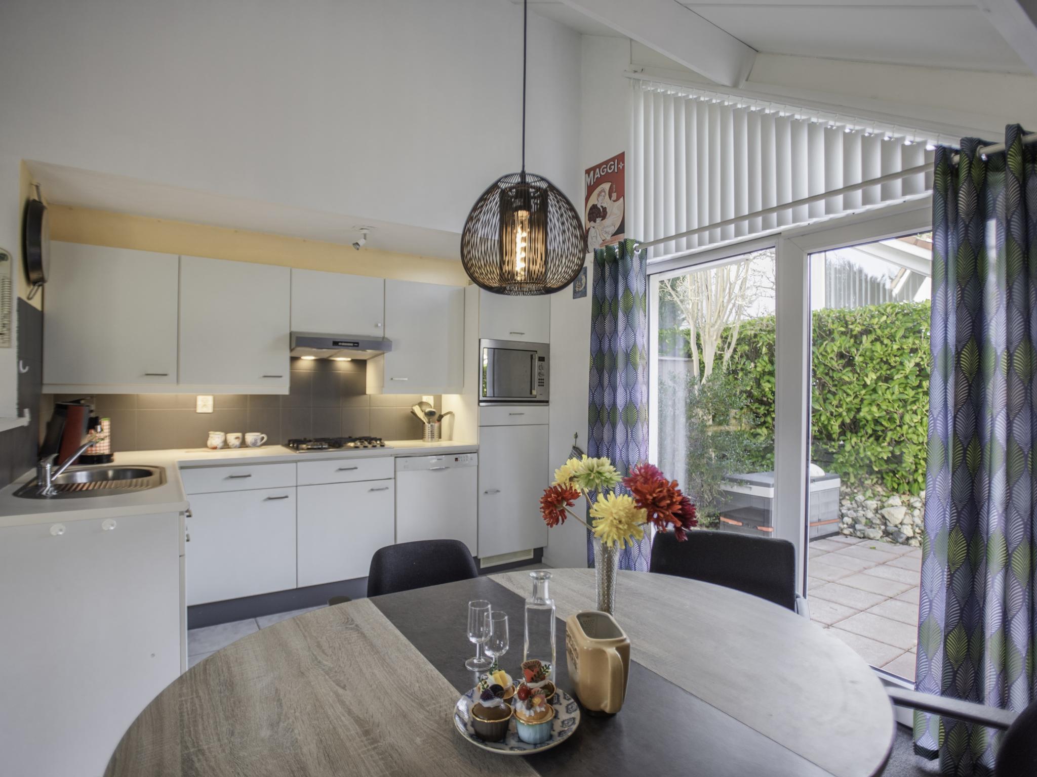 Begane grond: (hal, open keuken(fornuis, koffiezetapparaat(filtermaling), oven, magnetron, afwasmachine, koel-/vriescombinatie), woon/eetkamer(TV, eettafel, zithoek), slaapkamer(2-pers. bed), badkamer(douche, 2x wastafel, wc), wasruimte, wasmachine, verwarming(elektrisch), terras, tuin, tuinmeubilair, parking, parasol)
