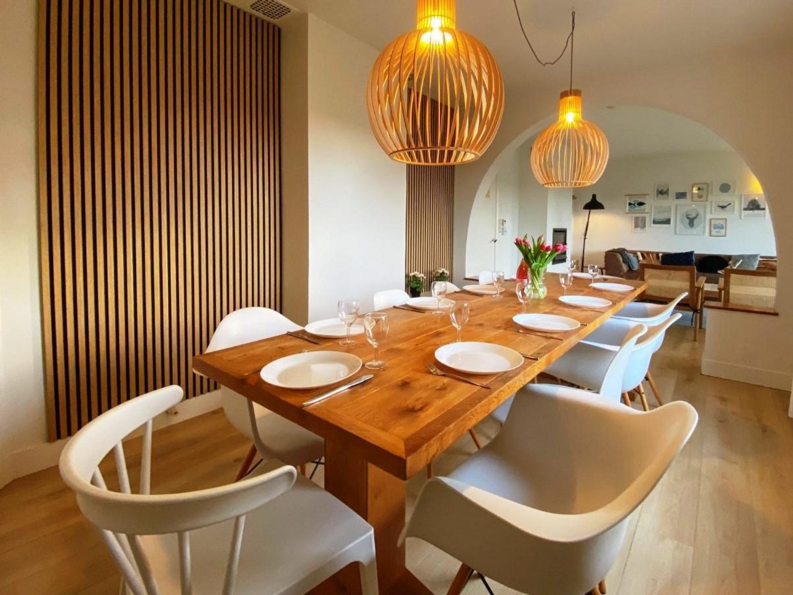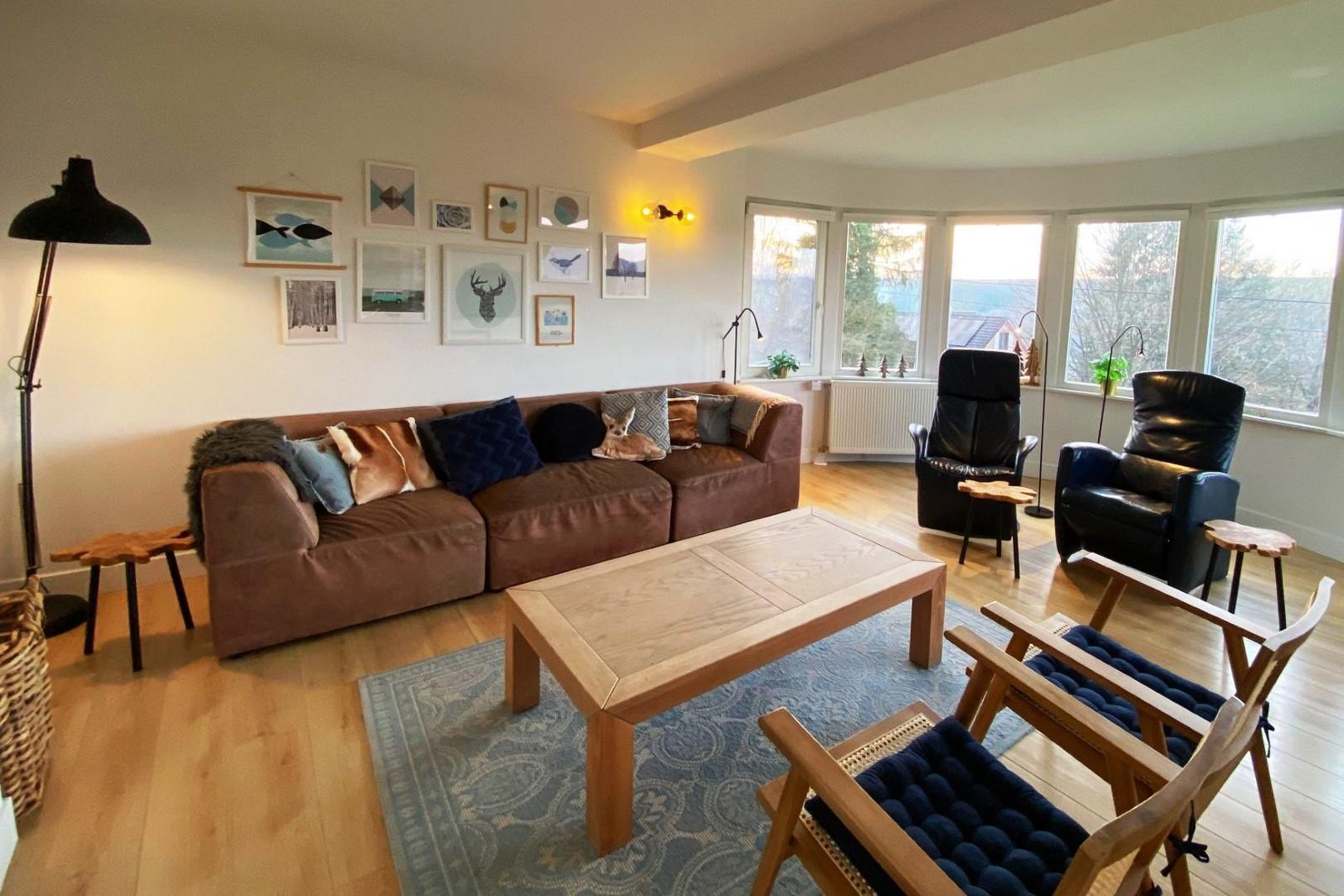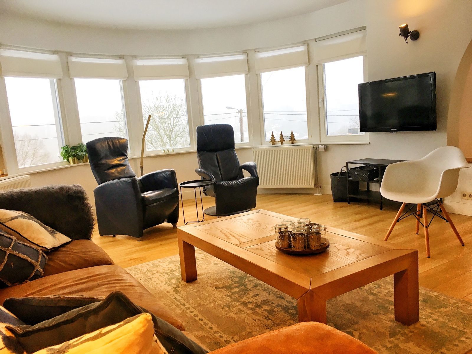 Woonkamer met comfortabel zitgedeelte, TV, Google Chromecast en open haard (hout zelf kopen).  Eettafel voor 10 personen.