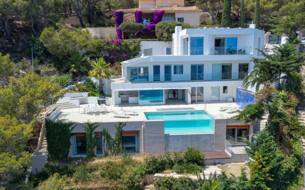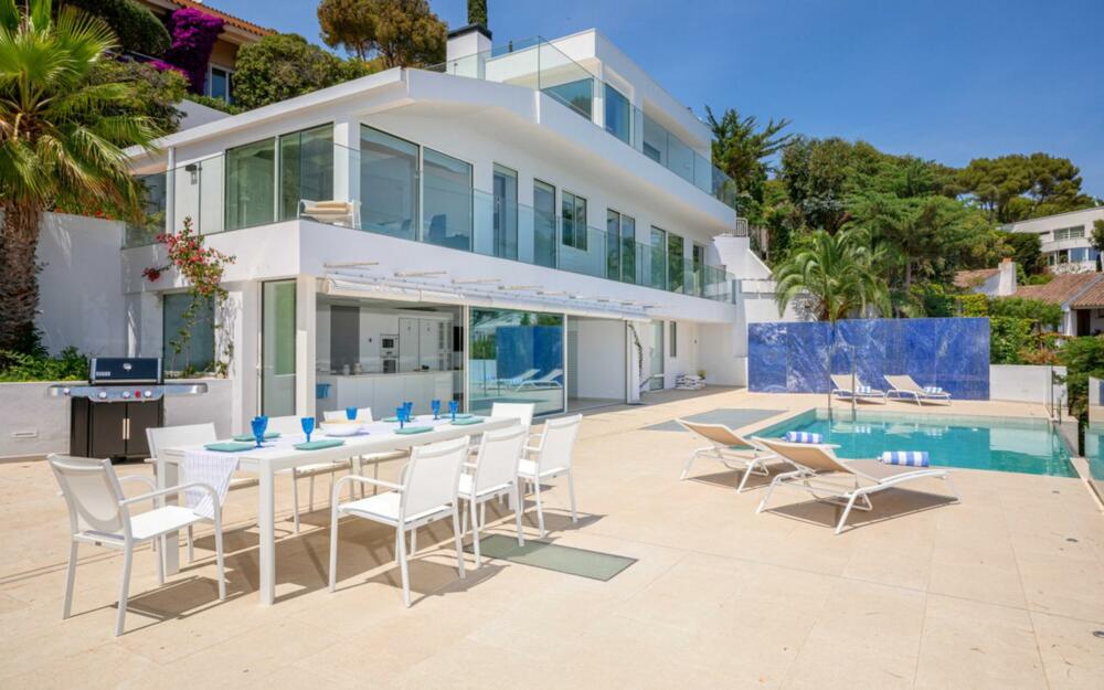 Het interieur van de woning geniet van uitzonderlijke lichtinval, dankzij de grote ramen. De woning bestaat uit vier verdiepingen. U komt binnen op de bovenste verdieping, waar u beschikt over een spectaculaire woonkamer, zeer ruim en licht en met een fantastisch uitzicht op de Middellandse Zee. Vanuit de woonkamer komt u op een groot terras, waar u de hele dag kunt ontspannen als u wilt. Op de verdieping hieronder bevinden zich vijf slaapkamers:- Suite 1: Een 2-persoonskamer met badkamer met douche en suite en een hoek terras;- Suite 2: Een 2-persoonskamer met badkamer met douche en suite en een terras;- Suite 3: Een 2-persoonskamer met badkamer met douche en suite en een terras;- Suite 4: Een 2-persoonskamer met badkamer met douche en suite en een terras;- Suite 5: Een mastersuite met 2-persoonsbed, een hoekterras en een badkamer die is geïntegreerd in de rotsen en beschikt over een losstaand bad en een douche.Alle kamers hebben uitzicht op zee, airconditioning en een televisie.Ook op deze verdieping is nog een badkamer en een waskamer met twee wasmachines en een droger.Weer een verdieping lager komt u bij het prachtige zwembad. Hier is ook weer een badkamer/wc en een grote keuken met kookeiland en toegang tot het zwembadgedeelte en de barbecue hoek. Uiteraard weer met een geweldig zeezicht. Tenslotte op de onderste verdieping vinden we de fitnessruimte met een badkamer, en kunt u onderwater in het zwembad kijken. Vanuit deze ruimte komt u ook bij de twee laaste suites:- Suite 6: Een 2-persoonskamer met douche en zeezicht- Suite 7: Een 2-persoonskamer met douche en zeezicht. Het hele huis is voorzien van WIFI en airconditioning en er is een lift aanwezig. Bij de huur is per dag 5 uur schoonmaak inbegrepen, van maandag t/m zaterdag.