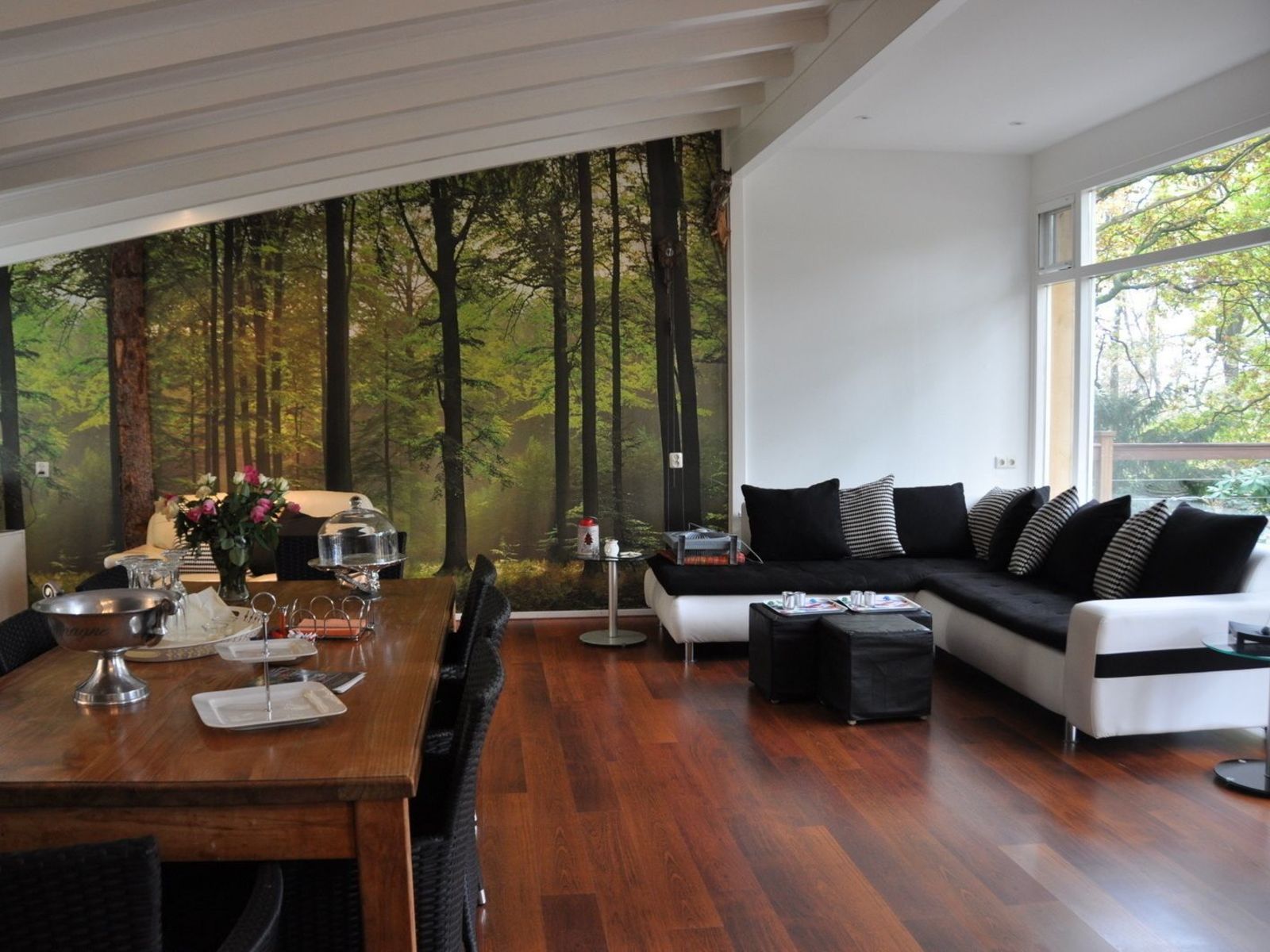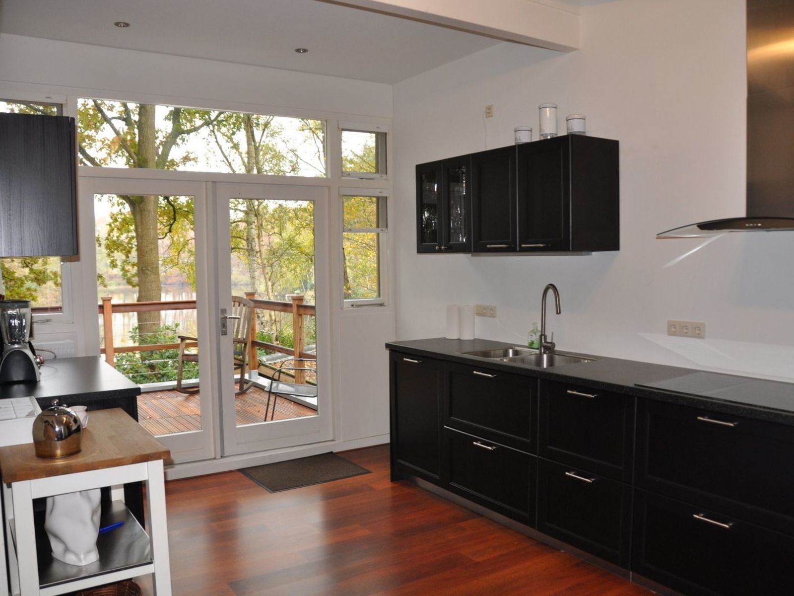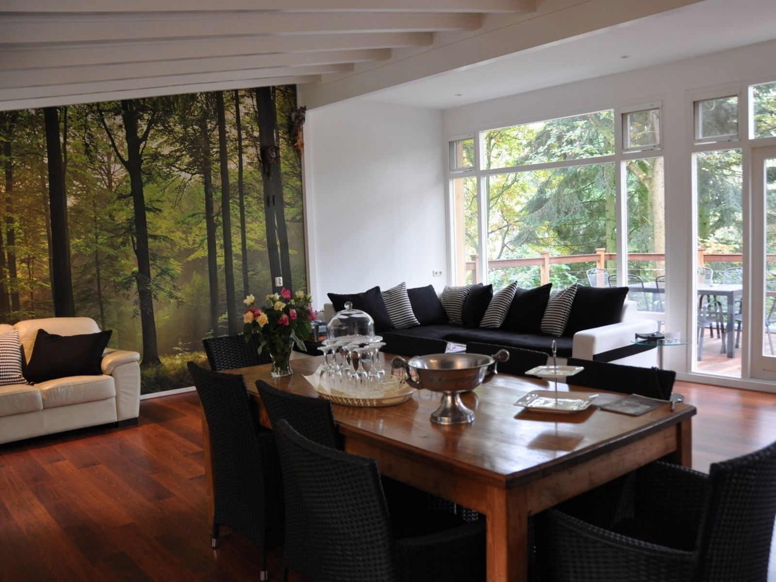 - Aan de achterzijde van de woonkamer is een terras met tuintafel en stoelen en uitzicht op de grote zwemvijver.