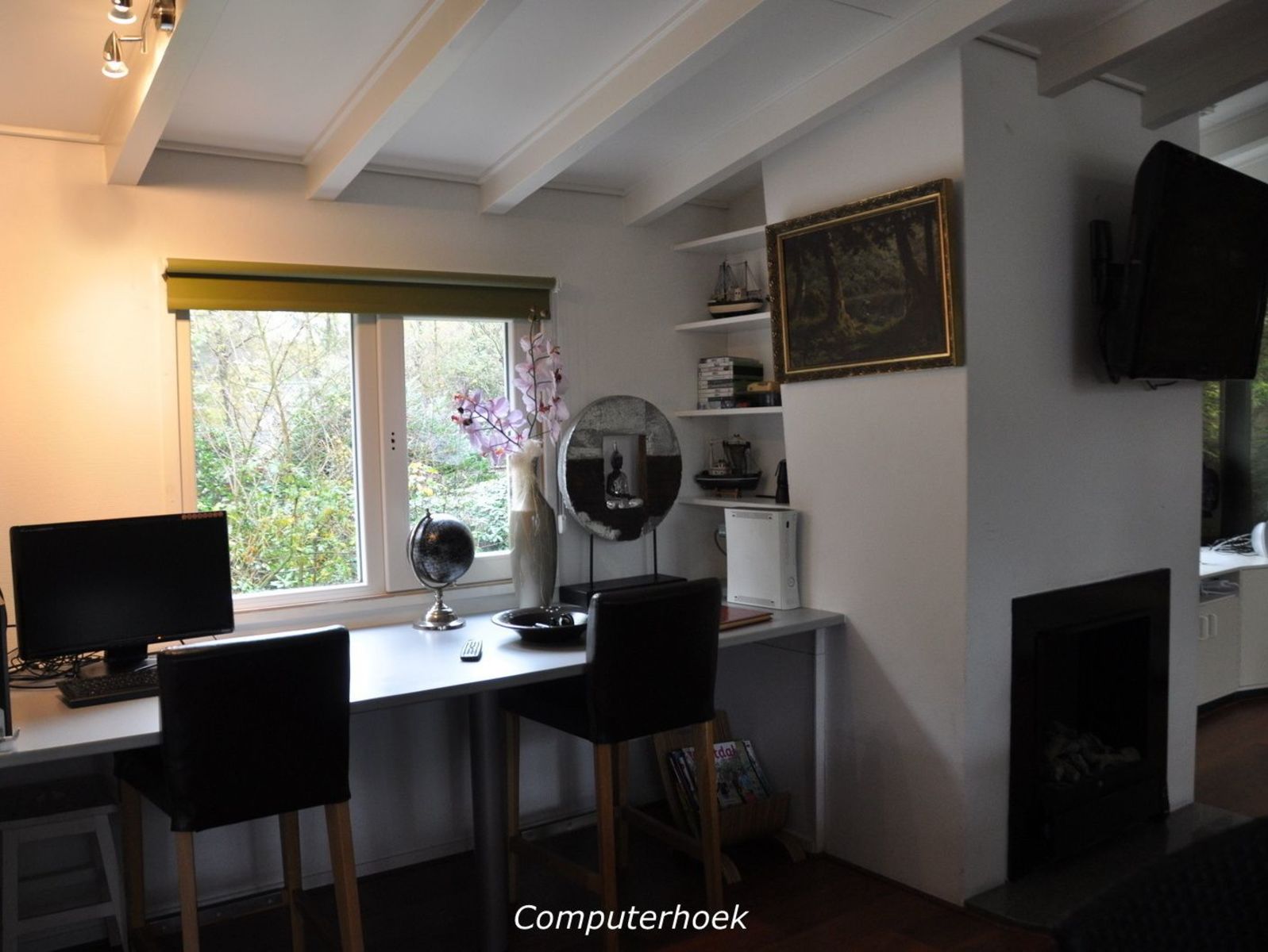 Woonkamer met een comfortabele zithoek bij de (elektrische) sfeerhaard, stereo, TV (120cm) en dvd. In een hoek staat een tafeltje met computer en een kast met boeken en gezelschapsspelen.
