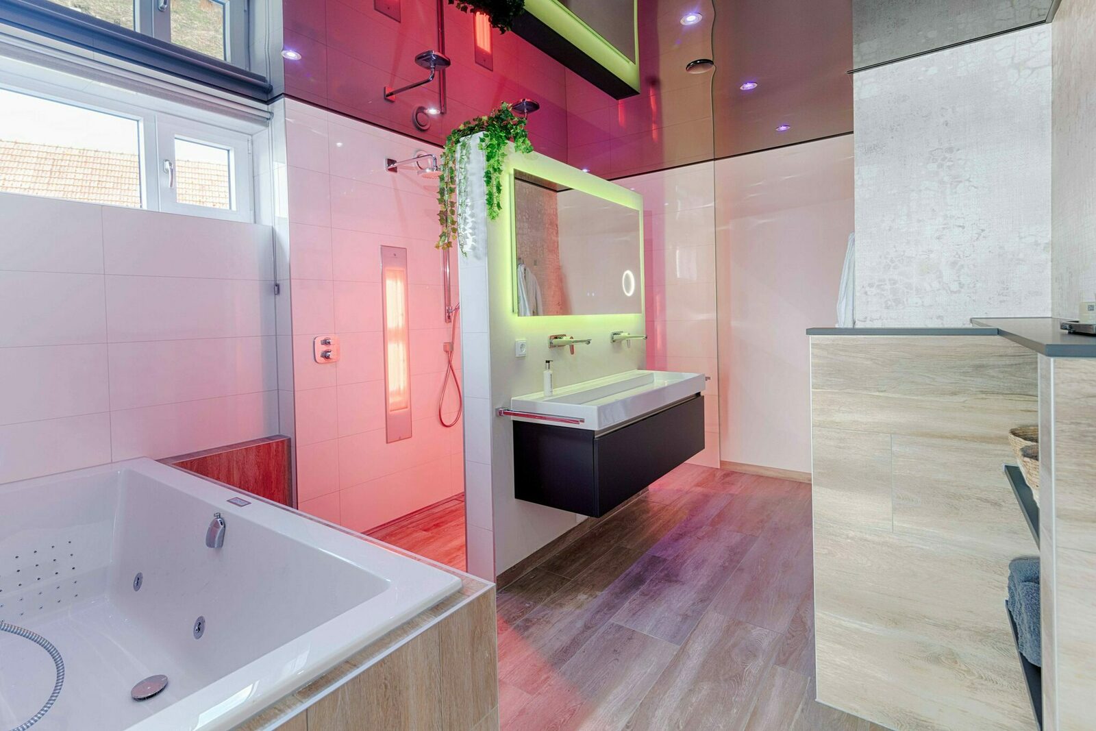 2 Badkamers met inloop regendouche met sunshower, dubbele wastafel en massagebad en toilet.