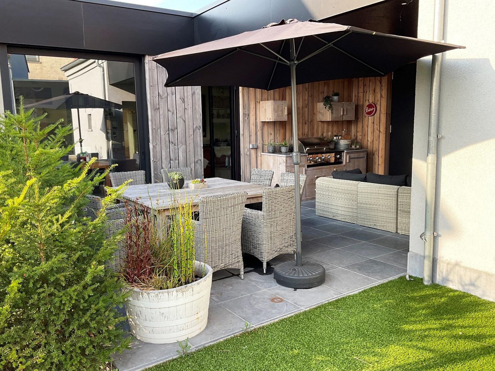 - Overdekt terras met buitenkeuken met o.a. Boretti gas barbecue met pizzaplaat, gaskookplaat, rookoven, gevogeltestomer, koelkast.