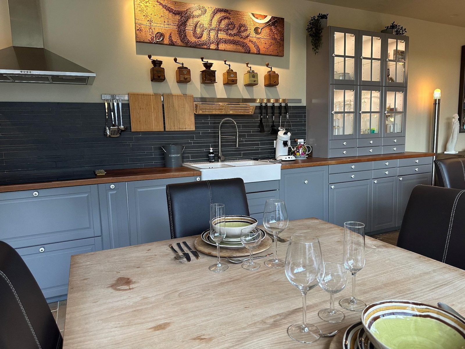 Open keuken met keramische kookplaat, grote koelkast met vriezer (3 lades), vaatwasser, combi-oven (hetelucht/stoom), combi-magnetron, Senseo, waterkoker, airfryer, pizzamaker.