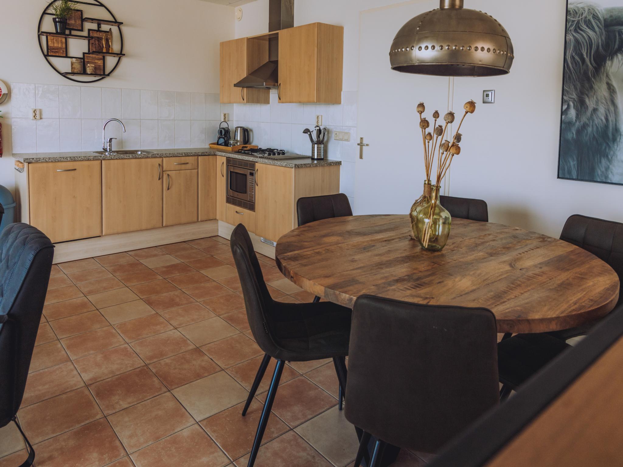 Begane grond: (woonkamer(TV(kabel, flatscreen, Nederlandse zender(s), Duitse zender(s), internationale zender(s)), eettafel, zithoek, DVD-speler, radio, CD-speler), keuken(kookplaat(4 kookplaten, gas), waterkoker, afzuigkap, koffiezetapparaat(cups), koffiezetapparaat(filtermaling), combimagnetron, afwasmachine, koel-/vriescombinatie), slaapkamer(2x 1-pers. bed(boxspring, 90 x 200 cm)), slaapkamer(stapelbed(90 x 200 cm)), slaapkamer(stapelbed(90 x 200 cm)), badkamer(bad of douche, wastafel, wc), toilet(wc), wasruimte(wasdroger, wasmachine))